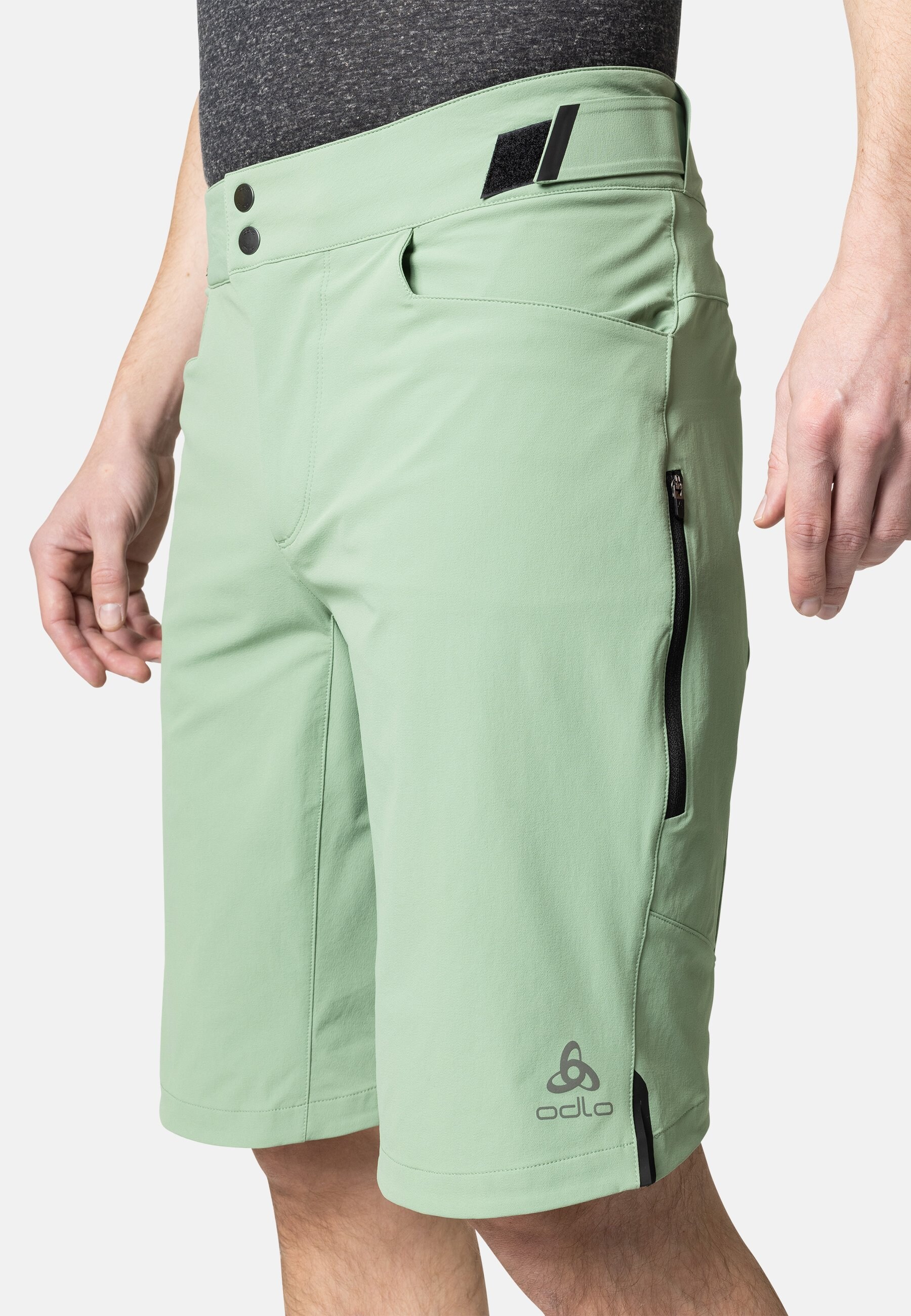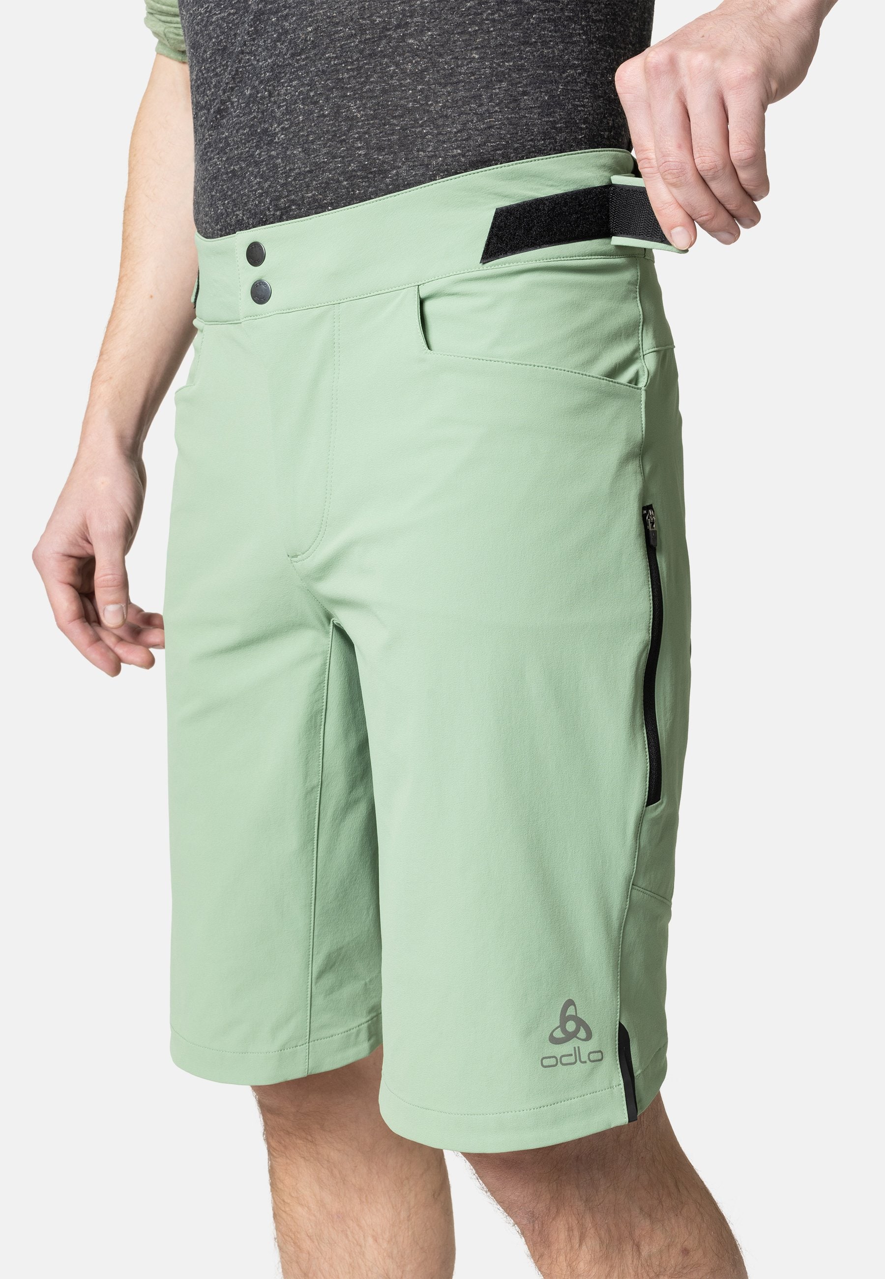 Lightweight, finished with a water-resistant coating, and made from 90 per cent recycled materials, the ODLO X-Alp Explorer MTB overshorts are designed to go big. Crafted from a hard-wearing double-weave fabric, these shorts boast two zippered pockets, two hand pockets, plenty of stretch and an adjustable waistband to lock in carrying capacity and comfort on the trail. Made without a chamois pad, intended to be worn overtop bibs or liner tight shorts, these shorts were made for mountain roads and then some. Durable, MTB-specific overshorts made from recycled materials. Crafted in Switzerland and made to explore.